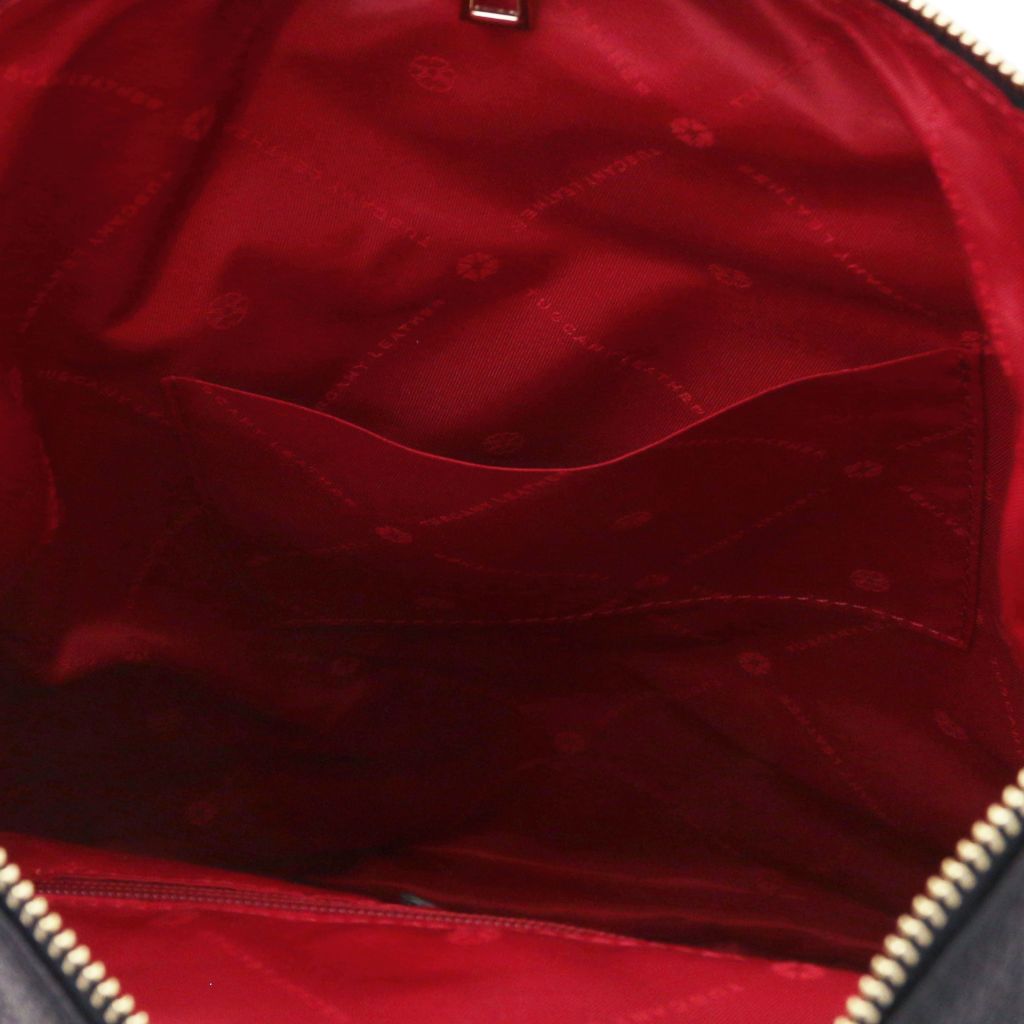 Oryginalny produkt Tuscany Leather©, certyfikat autentyczności i hologram uwierzytelniający w zestawie - Materiał: skóra o teksturze groszkowej, podszewka poliestrowa - Cechy: miękki korpus, 1 komora - Część zewnętrzna: metalowe TL logo, kieszeń z tyłu z zapięciem - Część wewnętrzna: kieszeń boczna niezamykana, kieszeń boczna na zamek - Pasek na ramię: regulowany, skórzany - Elementy metalowe: w kolorze złotym - Zapięcie: suwak - Akcesoria: pokrowiec - Wymiary: 25.50 x 34.00 x 13.50 cm - Waga: 0.65 Kg
