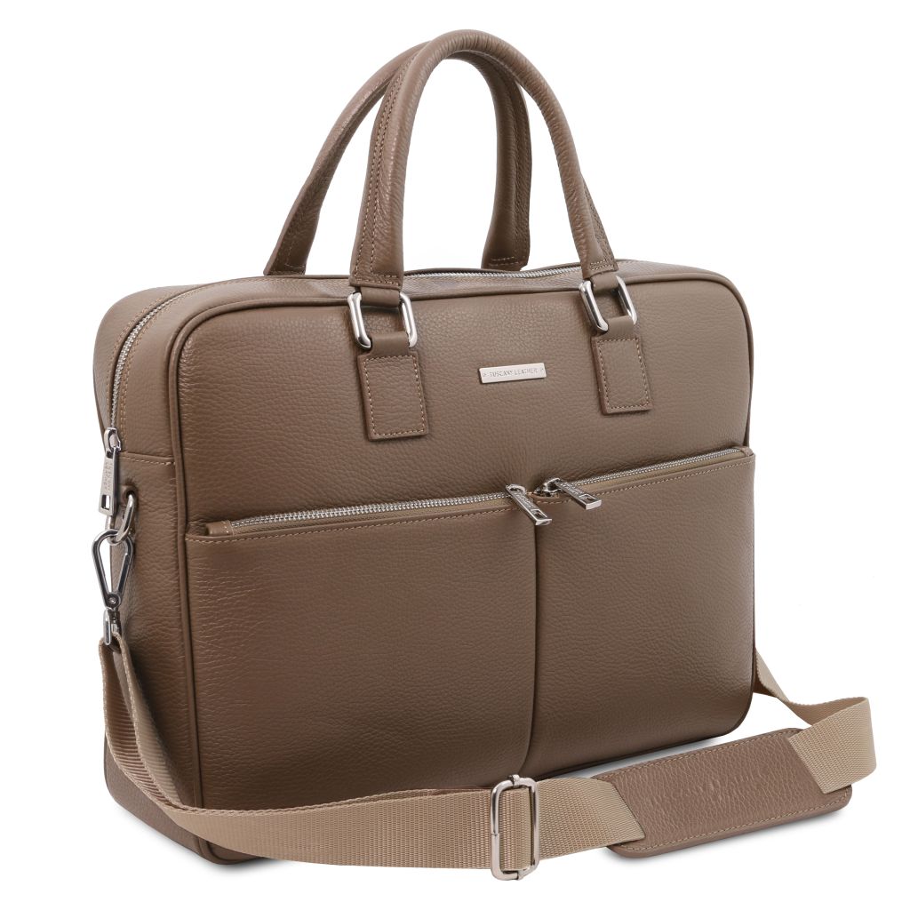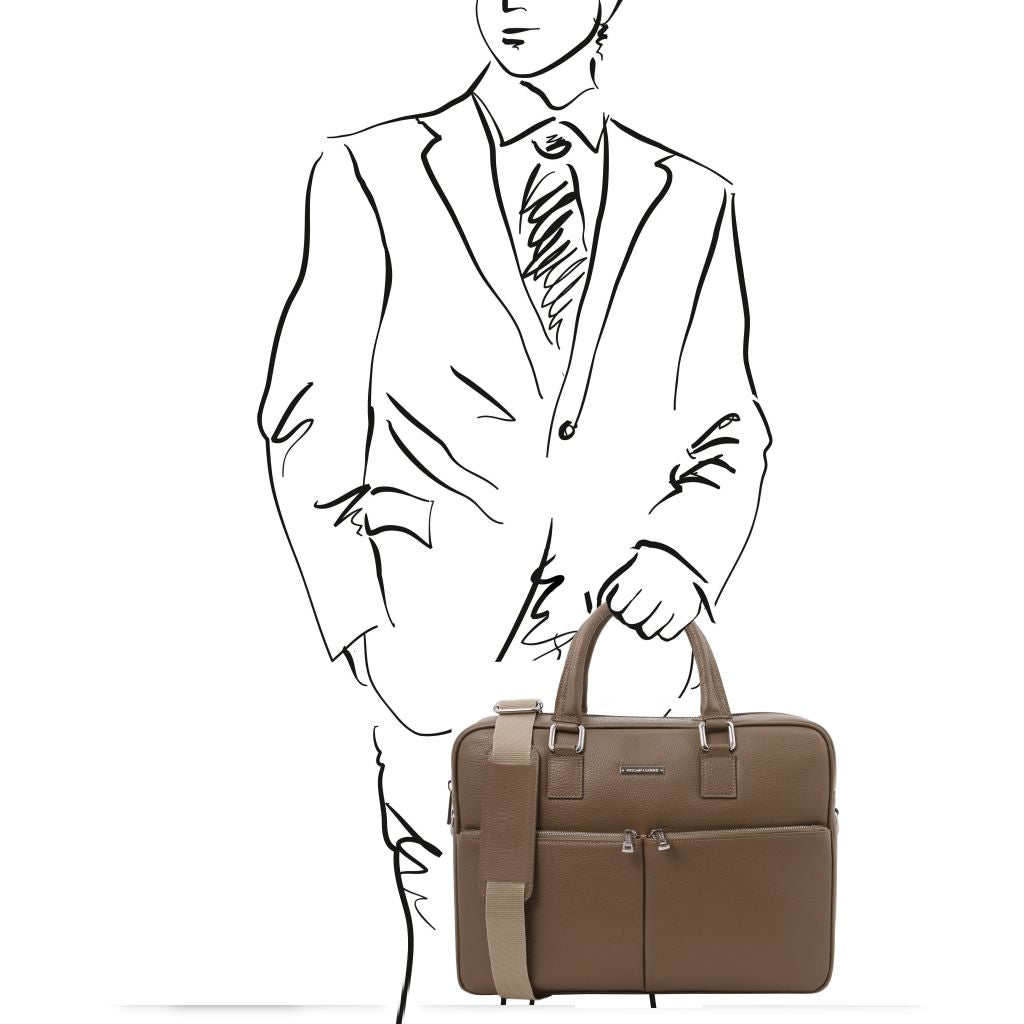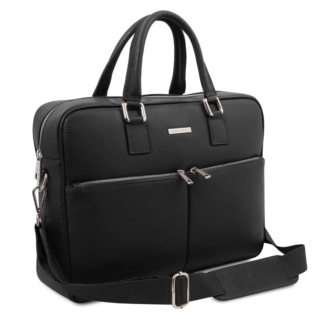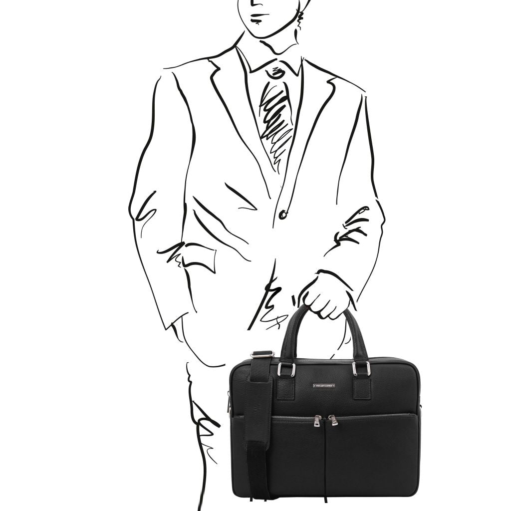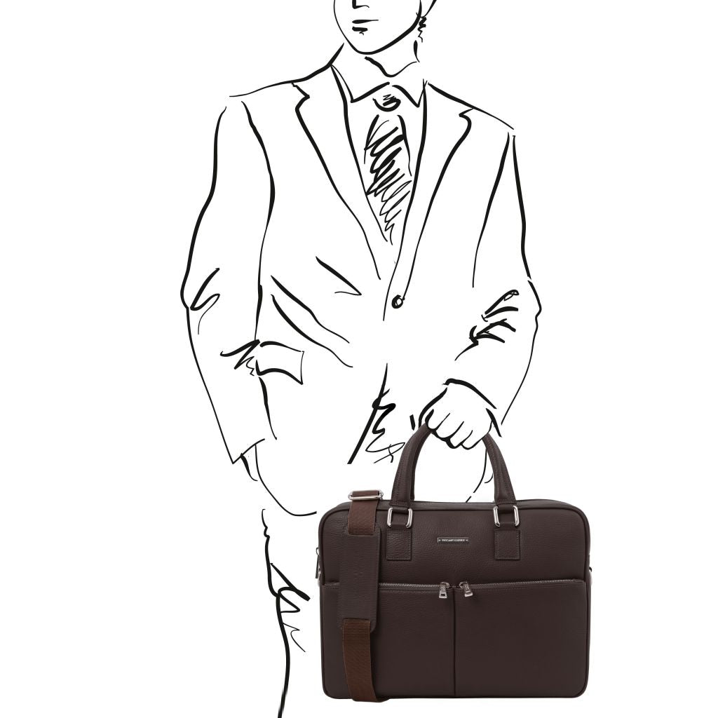 Oryginalny produkt Tuscany Leather©, certyfikat autentyczności i hologram uwierzytelniający w zestawie - Materiał: skóra o teksturze groszkowej, podszewka bawełniana - Cechy: półsztywny korpus, 1 komora - Część zewnętrzna: metalowe, prostokątne Tuscany Leather logo, 2 kieszenie z przodu z zapięciem - Część wewnętrzna: komora na laptopa, kieszeń zamykana, wyściełana przegroda - Pasek na ramię: odpinany, regulowany, skórzano-nylonowy - Pojemność: mieści format A4 - Elementy metalowe: w kolorze srebrnym - Zapięcie: zamek błyskawiczny - Akcesoria: pokrowiec - Wymiary zewnętrzne: 39.50 x 29.50 x 11.50 cm - Wymiary wewnętrzne (komór): 37.00 x 28.50 x 10.00 cm - Waga: 1.18 Kg