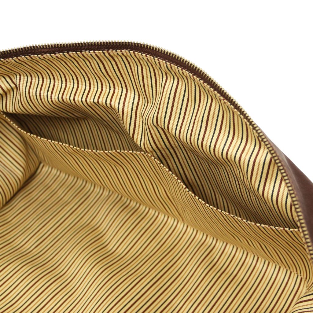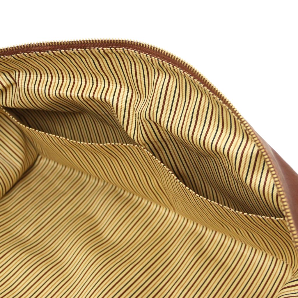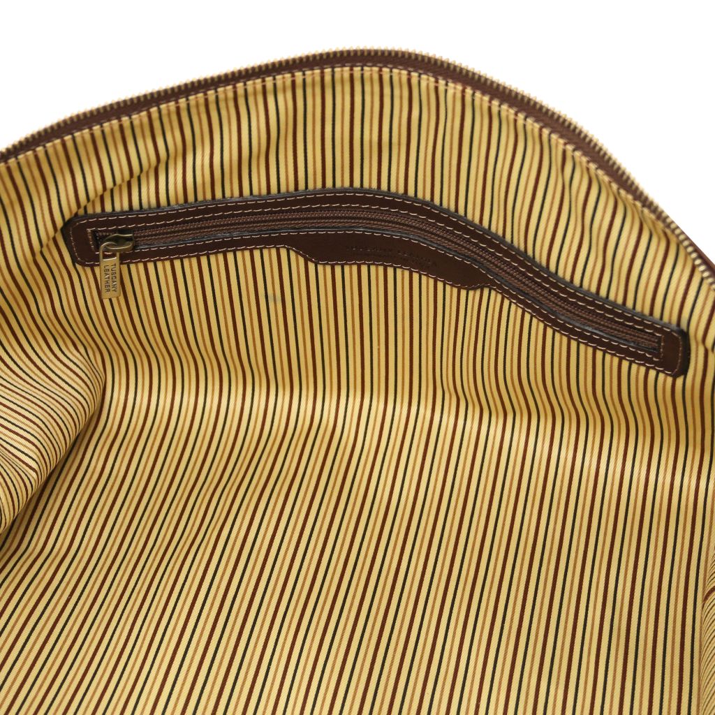 Oryginalny produkt Tuscany Leather©, certyfikat autentyczności i hologram uwierzytelniający w zestawie - Materiał: naturalna skóra licowa, ręcznie barwiona, garbowana przy użyciu tanin roślinnych, podszewka bawełniana - Cechy: miękki korpus, 1 komora - Część zewnętrzna: metalowe prostokątne Tuscany Leather logo, ochronne metalowe stopki na spodzie, przednia kieszeń z zamknięciem - Część wewnętrzna: kieszeń na zamek, 2 kieszenie niezamykane - Pasek na ramię: odpinany i regulowany, skórzany - Okucie: w kolorze szczotkowanego mosiądzu - Zamknięcie: zamek błyskawiczny - Akcesoria: pokrowiec, identyfikator bagażu - Wymiary: 51.00 x 28.00 x 27.50 cm - Waga: 2.05 Kg