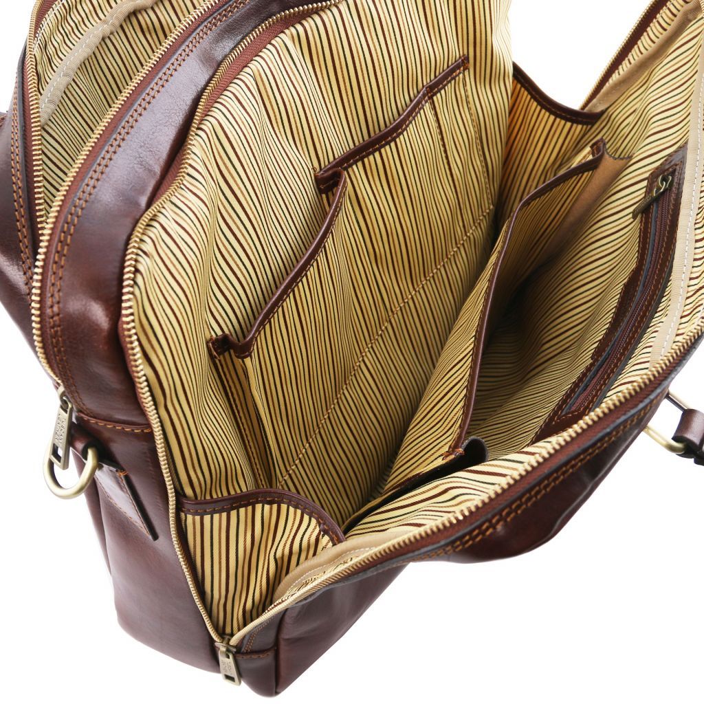 Oryginalny produkt Tuscany Leather©, certyfikat autentyczności i hologram uwierzytelniający w zestawie - Materiał: naturalna skóra licowa, ręcznie barwiona, garbowana przy użyciu tanin roślinnych, bawełniana podszewka - Cechy: miękki korpus, 2 komory - Część zewnętrzna: metalowe, prostokątne Tuscany Leather logo, mocowanie z tyłu umożliwiające nasunięcie teczki na wysuwaną rączkę walizki na kółkach, ochronne metalowe stopki na spodzie, przednia kieszeń z zamknięciem - Część wewnętrzna: przywieszka z brelokiem, wewnętrzna komora na laptopa, kieszeń na kartę płatniczą, kieszeń na zamek, 2 kieszenie niezamykane, 2 uchwyty na długopis, wyściełana przegroda - Pasek na ramię: odpinany i regulowany, skórzany - Pojemność: mieści format A4, mieści 15.6" laptopa - Elementy metalowe: w kolorze szczotkowanego mosiądzu, w kolorze srebrnym - Zapięcie: zamek błyskawiczny - Akcesoria: pokrowiec - Wymiary zewnętrzne: 40.00 x 30.00 x 15.00 cm - Wymiary wewnętrzne (komór): 38.00 x 28.00 x 8.00 cm - Waga: 1.40 Kg