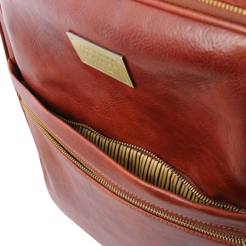Oryginalny produkt Tuscany Leather©, certyfikat autentyczności i hologram uwierzytelniający w zestawie - Materiał: naturalna skóra licowa, ręcznie barwiona, garbowana przy użyciu tanin roślinnych, podszewka bawełniana - Cechy: sztywny korpus, 1 komora, wysuwany uchwyt, obrotowe kółka - Część zewnętrzna: metalowe prostokątne Tuscany Leather logo, ochronne metalowe stopki na spodzie, przednia kieszeń z zamknięciem, 2 przednie kieszenie z zamknięciem, kieszeń boczna z zamknięciem - Część wewnętrzna: kieszeń na zamek, wewnętrzne taśmy przytrzymujące zawartość - Okucie: w kolorze szczotkowanego mosiądzu, w kolorze srebrnym - Zamknięcie: zamek błyskawiczny - Akcesoria: pokrowiec, identyfikator bagażu - Wymiary: 35.50 x 46.00 x 21.00 cm - Waga: 3.90 Kg