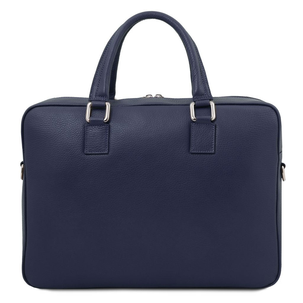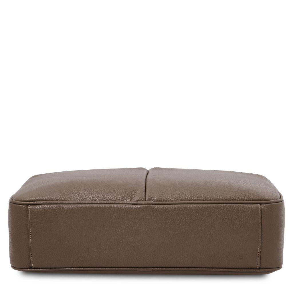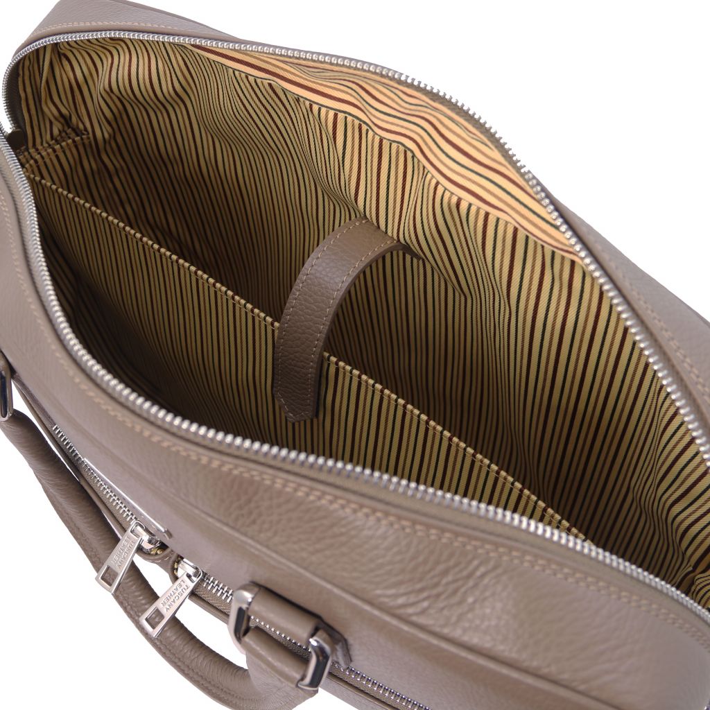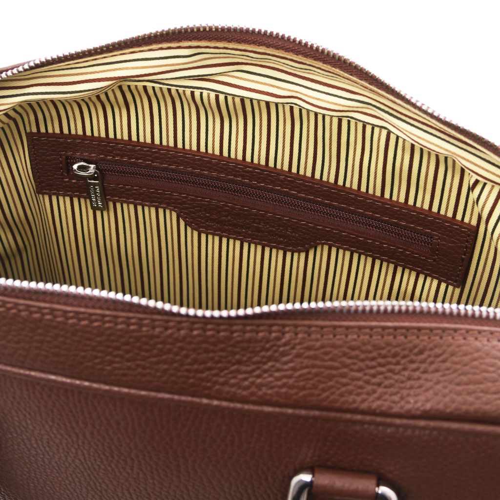 Oryginalny produkt Tuscany Leather©, certyfikat autentyczności i hologram uwierzytelniający w zestawie - Materiał: skóra o teksturze groszkowej, bawełniana podszewka - Cechy: półsztywny korpus, 2 komory - Część zewnętrzna: metalowe, prostokątne Tuscany Leather logo, 2 przednie kieszenie z zamknięciem - Część wewnętrzna: komora na laptopa, kieszeń na zamek, wyściełana przegroda - Pasek na ramię: odpinany i regulowany, nylonowo-skórzany - Pojemność: mieści format A4 - Elementy metalowe: w kolorze srebrnym - Zapięcie: zamek błyskawiczny - Akcesoria: pokrowiec - Wymiary zewnętrzne: 39.50 x 29.50 x 11.50 cm - Wymiary wewnętrzne (komór): 37.00 x 28.50 x 10.00 cm - Waga: 1.18 Kg