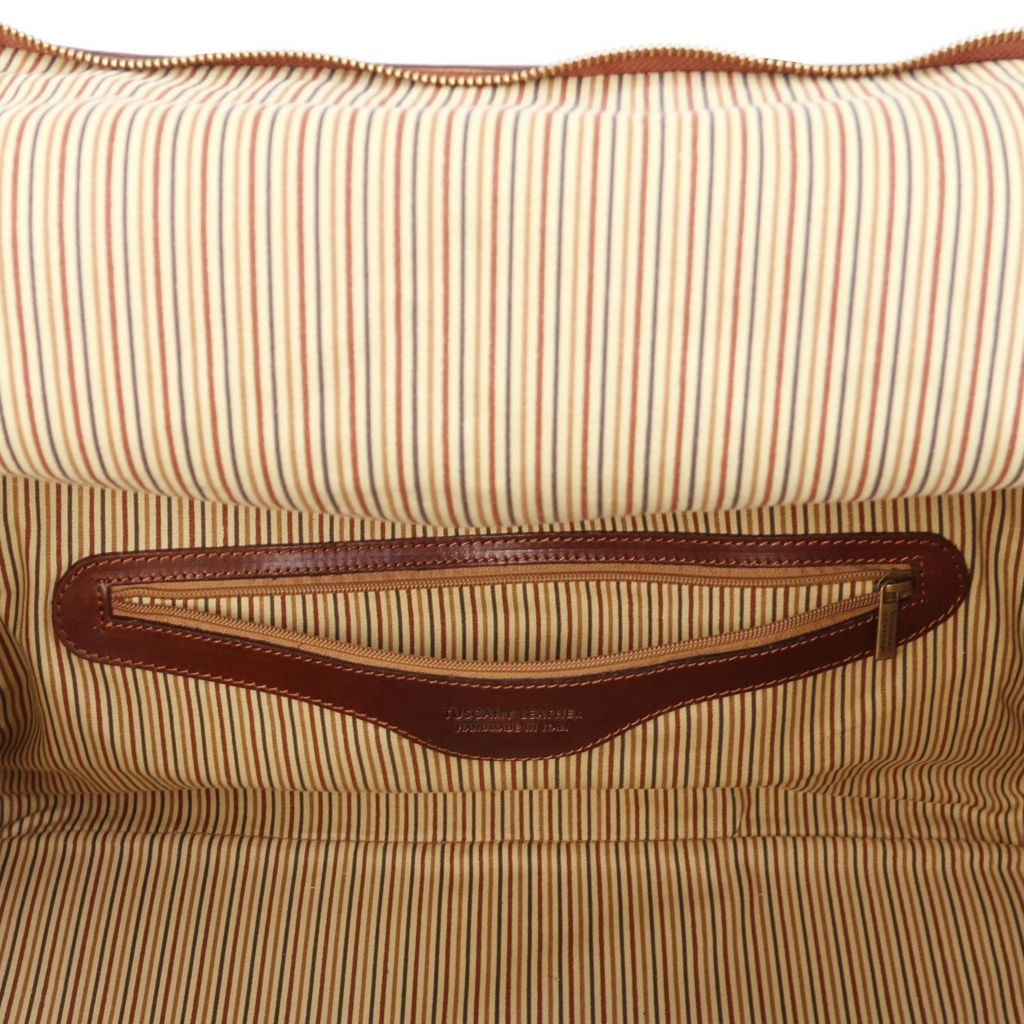 Oryginalny produkt Tuscany Leather©, certyfikat autentyczności i hologram uwierzytelniający w zestawie - Materiał: naturalna skóra licowa, ręcznie barwiona, garbowana przy użyciu tanin roślinnych, podszewka bawełniana - Cechy: miękki korpus, 1 komora - Część zewnętrzna: metalowe prostokątne Tuscany Leather logo, ochronne metalowe stopki na spodzie, przednia kieszeń z zamknięciem, kieszeń boczna z zamknięciem, 2 kieszenie boczne z zamknięciem - Część wewnętrzna: kieszeń niezamykana, kieszeń na zamek - Pasek na ramię: odpinany i regulowany, skórzany - Okucie: w kolorze szczotkowanego mosiądzu, w kolorze srebrnym - Zamknięcie: zamek błyskawiczny - Akcesoria: pokrowiec, identyfikator bagażu - Wymiary: 51.50 x 28.00 x 24.50 cm - Waga: 2.10 Kg