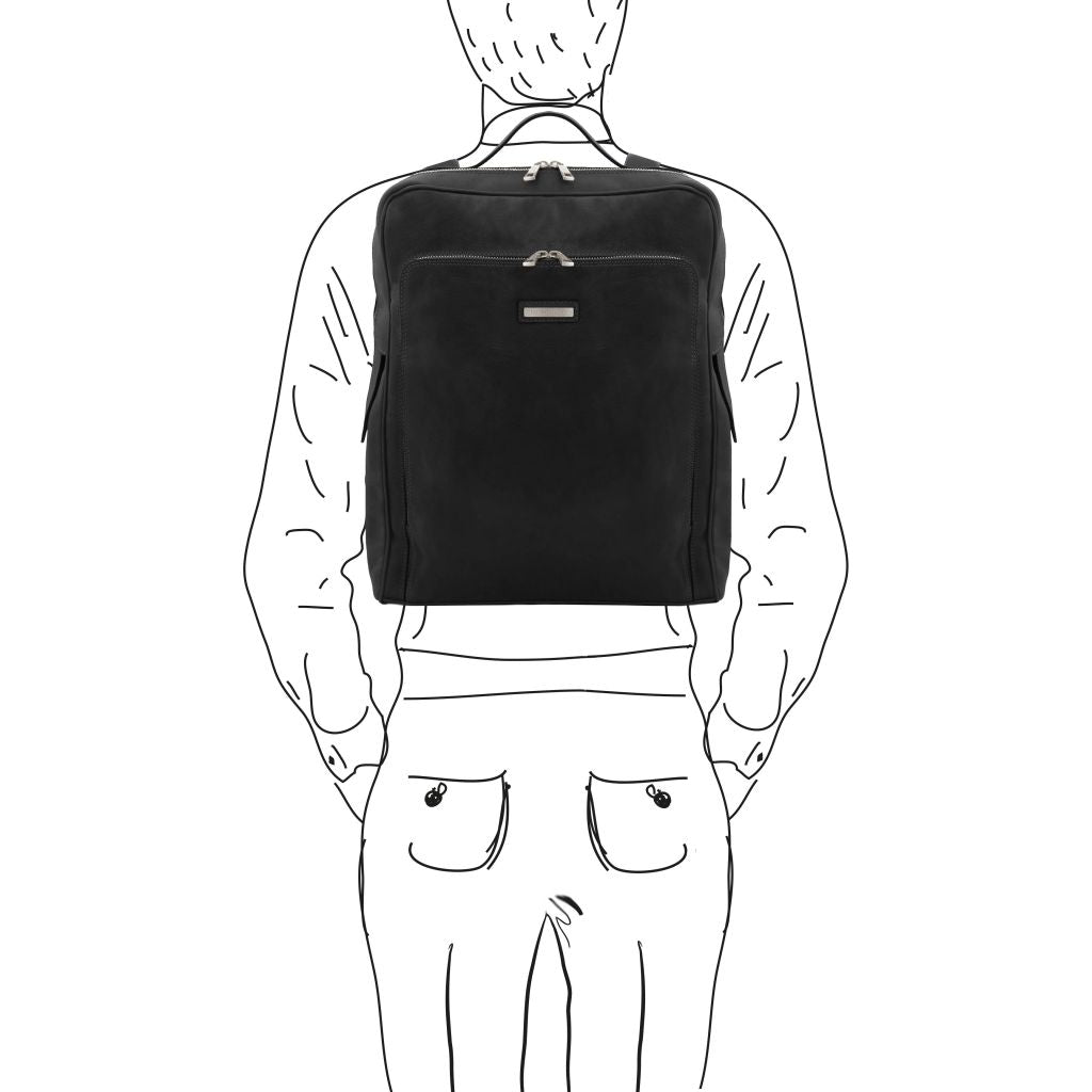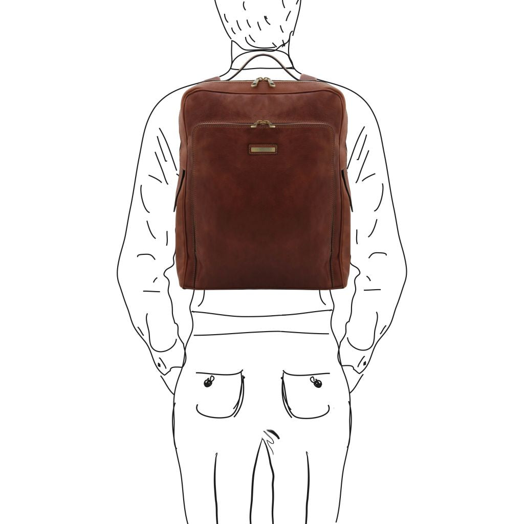 Oryginalny produkt Tuscany Leather©, certyfikat autentyczności i hologram uwierzytelniający w zestawie - Materiał: matowa, naturalna skóra licowa, ręcznie barwiona, garbowana przy użyciu tanin roślinnych, bawełniana podszewka - Cechy: półsztywny korpus, 1 komora - Część zewnętrzna: metalowe, prostokątne Tuscany Leather logo, mocowanie z tyłu umożliwiające nasunięcie plecaka na wysuwaną rączkę walizki na kółkach, przednia kieszeń z zamknięciem, kieszeń z tyłu z zamknięciem - Część wewnętrzna: środkowa komora na laptopa, przywieszka na brelok, kieszeń na kartę płatniczą, kieszeń na zamek, 2 kieszenie niezamykane, wyściełana przegroda, uchwyt na długopis - Pasek na ramię: regulowany skórzany - Pojemność: mieści format A4, mieści 17" laptopa - Elementy metalowe: w kolorze szczotkowanego mosiądzu - Zapięcie: zamek błyskawiczny z 3 stron - Akcesoria: pokrowiec - Wymiary zewnętrzne: 34.50 x 43.50 x 10.00 cm - Wymiary wewnętrzne (komór): 29.00 x 40.00 x 6.00 cm - Waga: 1.40 Kg