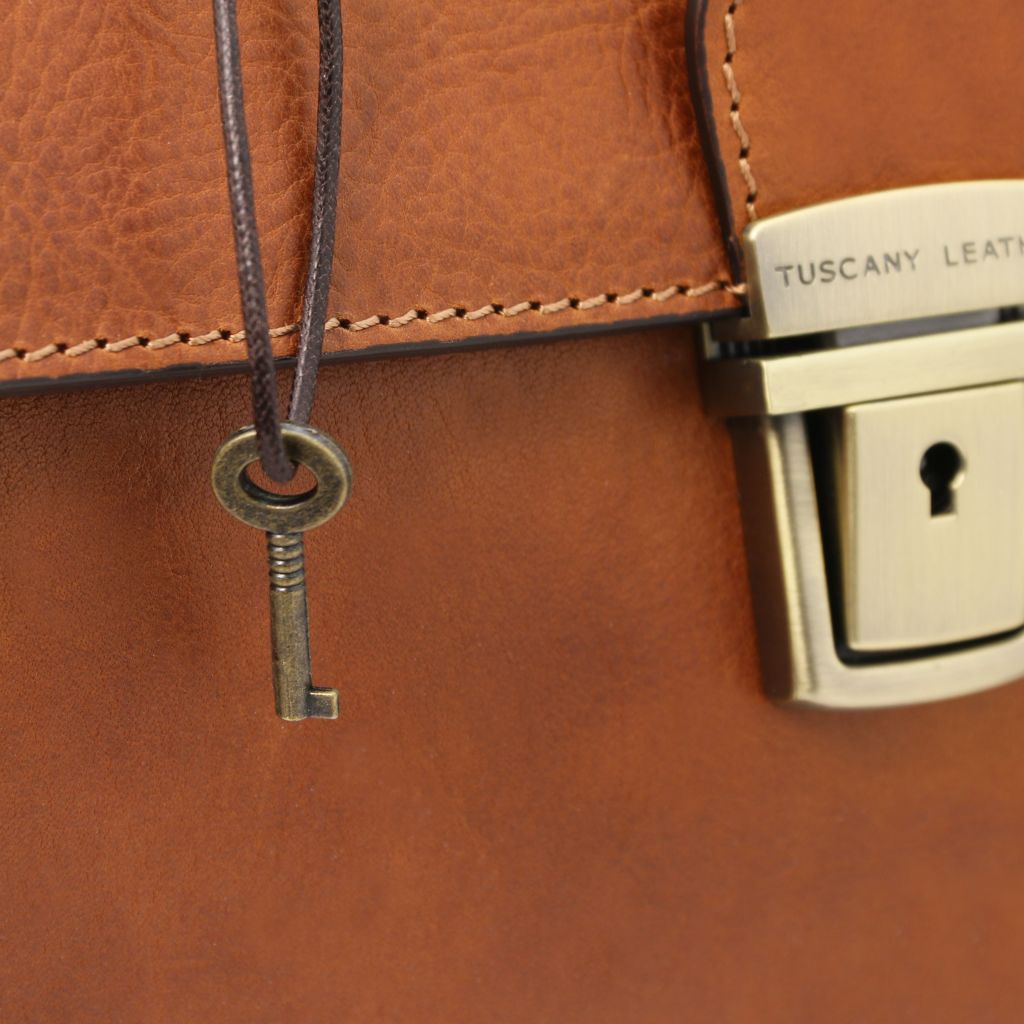 Oryginalny produkt Tuscany Leather©, certyfikat autentyczności i hologram uwierzytelniający w zestawie - Materiał: matowa, naturalna skóra licowa, ręcznie barwiona, garbowana przy użyciu tanin roślinnych, podszewka bawełniana - Cechy: sztywny korpus, 1 komora, podwójne dno - Część zewnętrzna: ochronne metalowe stopki na spodzie, przednia kieszeń z zapięciem - Część wewnętrzna: kieszeń niezamykana, kieszenie na karty płatnicze, kieszeń na zamek, uchwyt na długopis - Pojemność: mieści format A4 - Okucie: w kolorze szczotkowanego mosiądzu, w kolorze srebrnym - Zapięcie: metalowa, wciskana sprzączka na kluczyk z wygrawerowanym Tuscany Leather logo - Akcesoria: pokrowiec - Wymiary: 41.00 x 27.00 x 16.50 cm - Waga: 1.90 Kg
