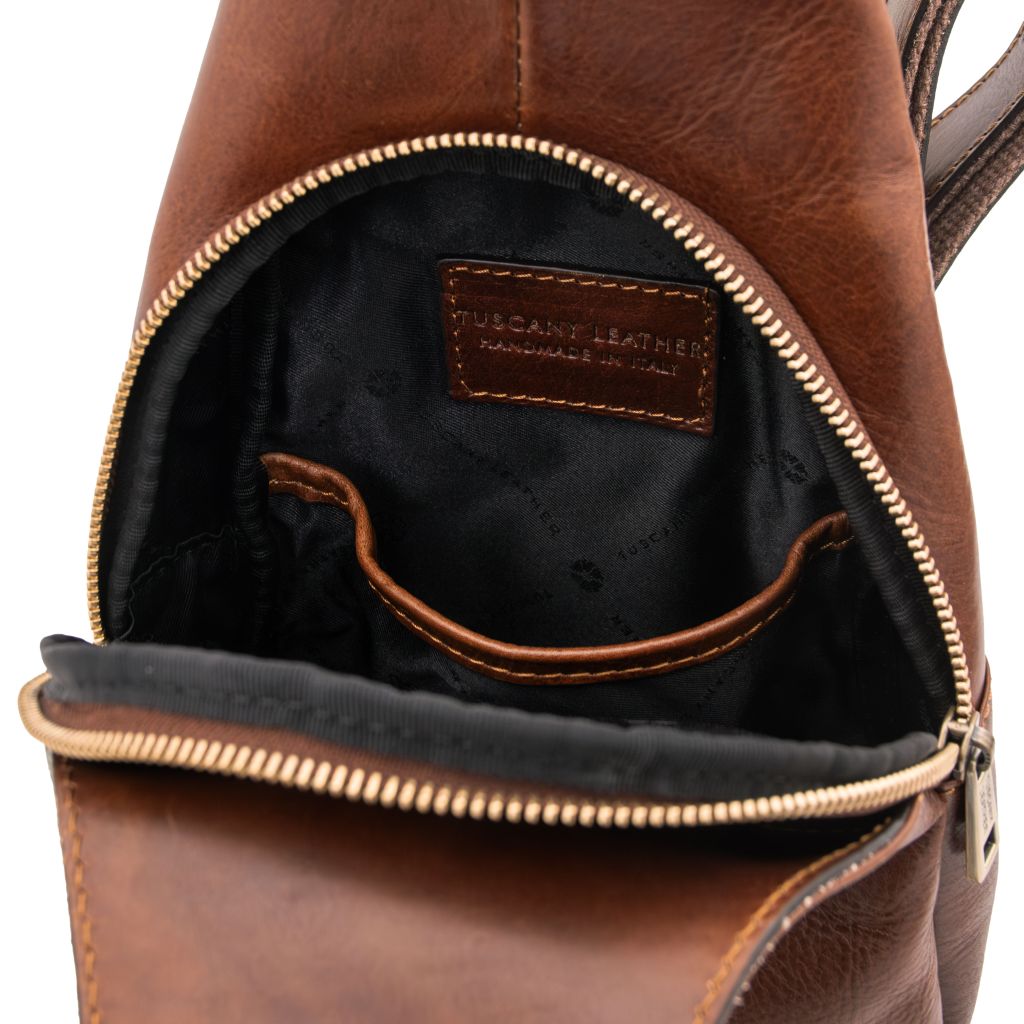 Oryginalny produkt Tuscany Leather©, certyfikat autentyczności i hologram uwierzytelniający w zestawie - Materiał: matowa, naturalna skóra licowa, ręcznie barwiona, garbowana przy użyciu tanin roślinnych, poliestrowa podszewka - Cechy: półsztywny korpus, 1 komora - Część zewnętrzna: przednia kieszeń z zapięciem, kieszeń z tyłu z zapięciem - Część wewnętrzna: niezamykana kieszeń - Pasek: regulowany, skórzany i tkaninowy - Elementy metalowe: w kolorze szczotkowanego mosiądzu, w kolorze srebrnym - Zapięcie: zamek błyskawiczny, zatrzask magnetyczny - Akcesoria: pokrowiec - Wymiary: 16.00 x 31.00 x 8.00 cm - Waga: 0.50 Kg