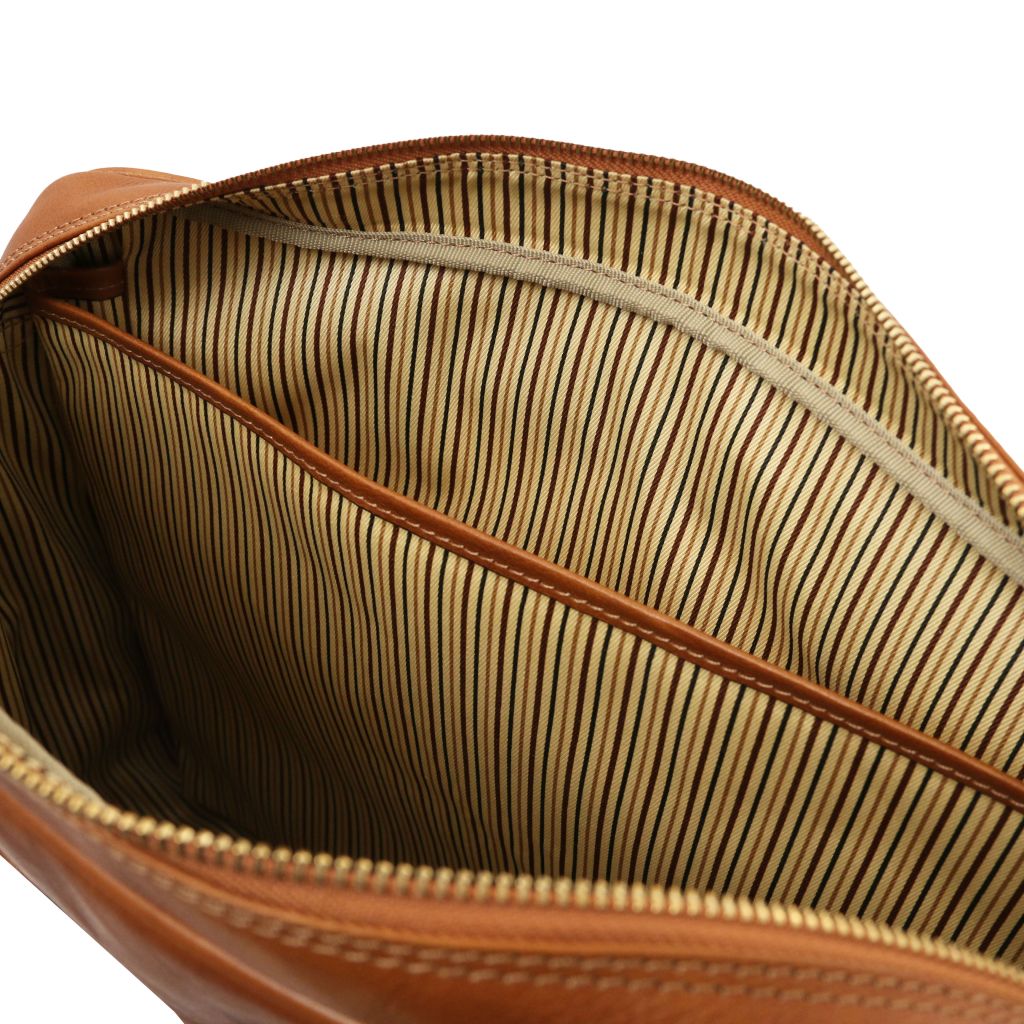 Oryginalny produkt Tuscany Leather©, certyfikat autentyczności i hologram uwierzytelniający w zestawie - Materiał: matowa, naturalna skóra licowa, ręcznie barwiona, garbowana przy użyciu tanin roślinnych, bawełniana podszewka - Cechy: półsztywny korpus, 2 komory, element amortyzujący - Część zewnętrzna: metalowe, prostokątne Tuscany Leather logo, przednia kieszeń z zamknięciem, kieszeń z tyłu z zamknięciem - Część wewnętrzna: komora na laptopa, kieszeń na zamek, wewnętrzna wyściełana przegroda - Pasek na ramię: odpinany i regulowany, skórzany - Pojemność: mieści format A4 - Elementy metalowe: w kolorze szczotkowanego mosiądzu, w kolorze srebrnym - Zapięcie: zamek błyskawiczny - Akcesoria: pokrowiec - Wymiary zewnętrzne: 40.00 x 31.50 x 11.00 cm - Wymiary wewnętrzne (komór): 35.00 x 30.00 cm - Waga: 1.35 Kg