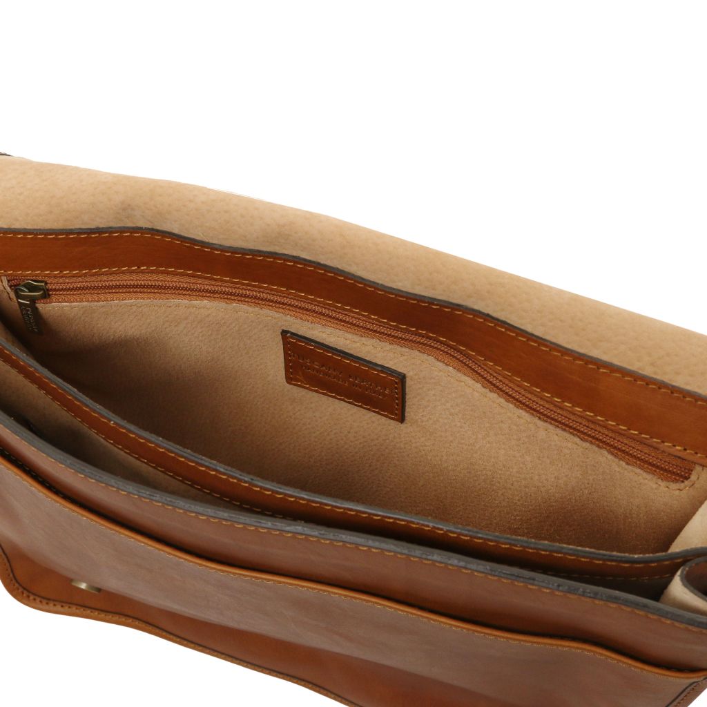 Oryginalny produkt Tuscany Leather©, certyfikat autentyczności i hologram uwierzytelniający w zestawie - Materiał: matowa, naturalna skóra licowa, ręcznie barwiona, garbowana przy użyciu tanin roślinnych, skórzana podszewka - Cechy: miękki korpus, 2 komory - Część zewnętrzna: metalowe, prostokątne Tuscany Leather logo, kieszeń z przodu, tylna kieszeń z zapięciem - Część wewnętrzna: kieszeń niezamykana, kieszeń na kartę płatniczą, kieszeń na zamek, uchwyt na długopis - Pasek na ramię: regulowany skórzany - Pojemność: mieści format A4 - Elementy metalowe: w kolorze srebrnym, w kolorze szczotkowanego mosiądzu - Zapięcie: zatrzask magnetyczny - Akcesoria: pokrowiec - Wymiary zewnętrzne: 37.00 x 29.50 x 11.00 cm - Wymiary wewnętrzne: 35.00 x 26.00 x 5.50 cm - Waga: 1.30 Kg