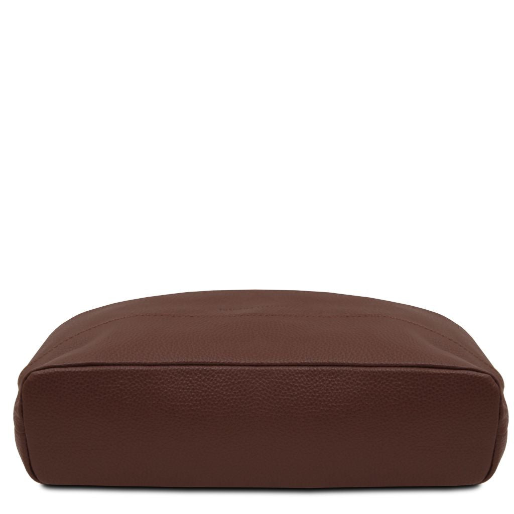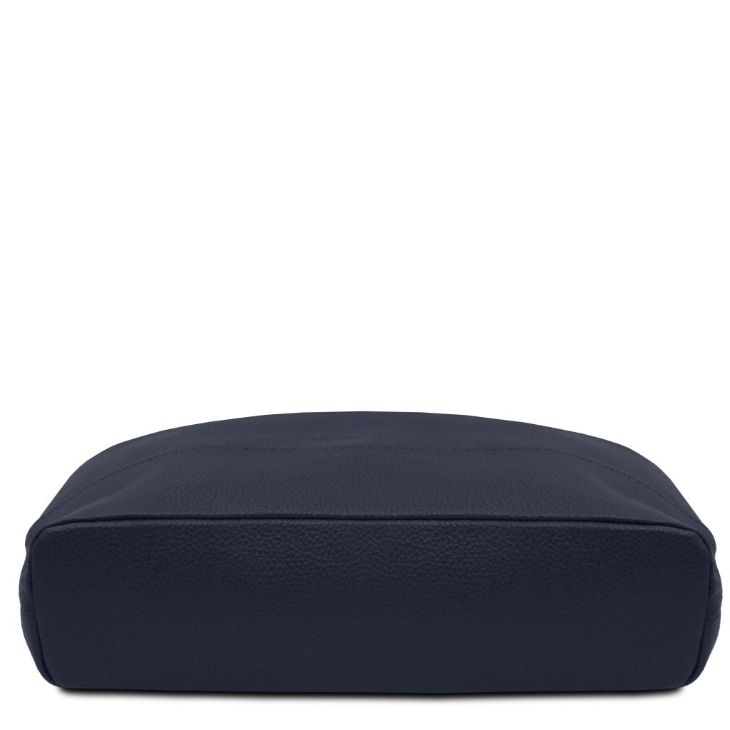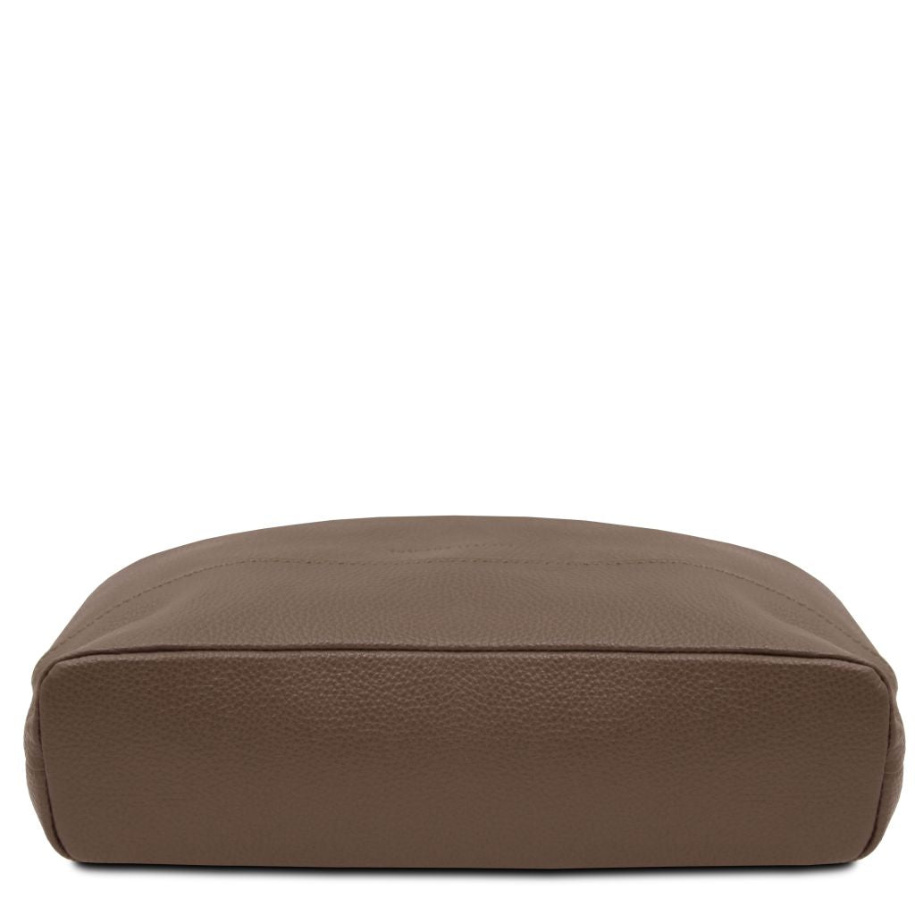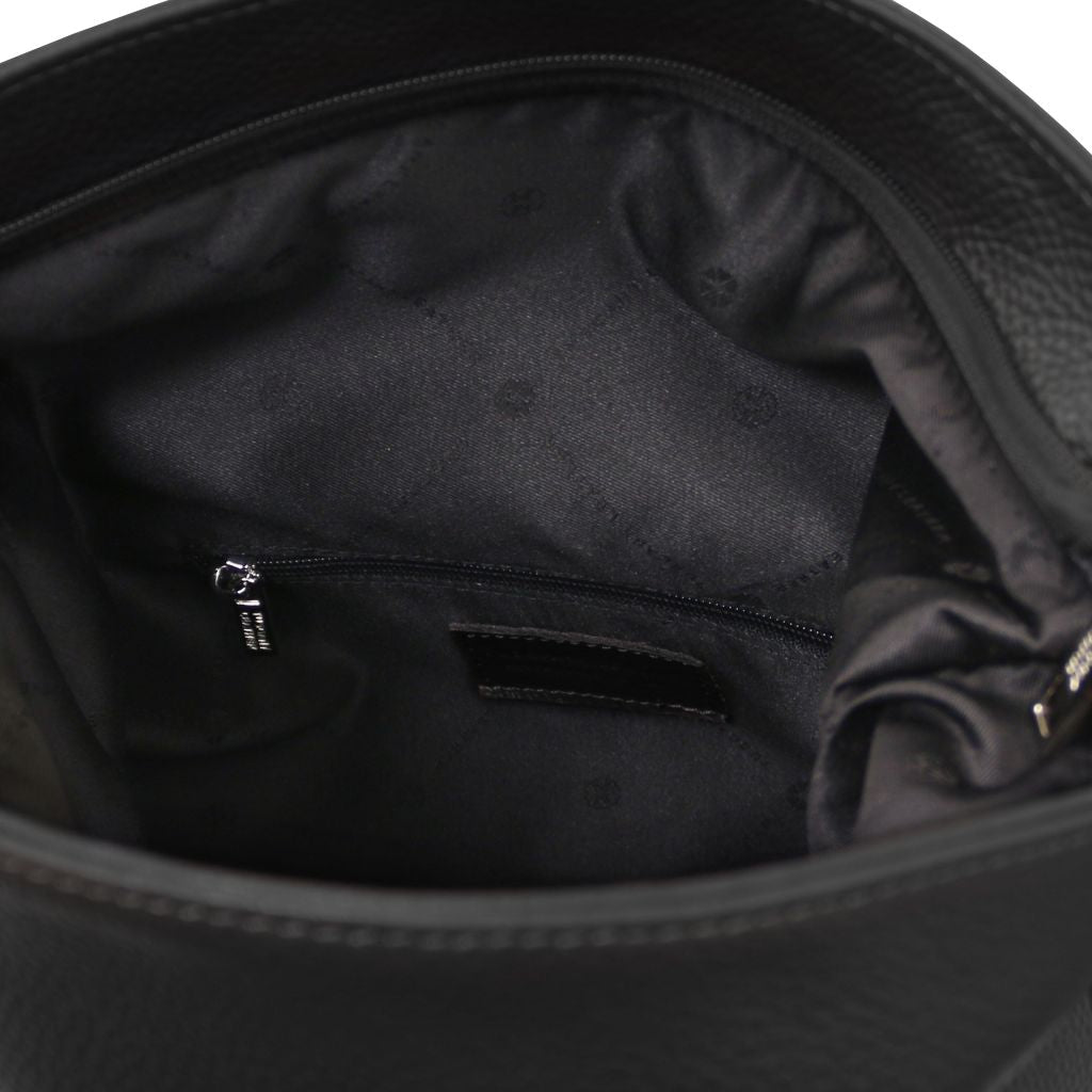 Oryginalny produkt Tuscany Leather©, certyfikat autentyczności i hologram uwierzytelniający w zestawie - Materiał: skóra o teksturze groszkowej, podszewka poliestrowa - Cechy: miękki korpus, 1 komora - Część zewnętrzna: nadruk z Tuscany Leather logo, przednia kieszeń z zapięciem, tylna kieszeń z zapięciem - Część wewnętrzna: kieszeń na zamek, 2 kieszenie niezamykane - Pasek na ramię: regulowany, skórzany - Pojemność: mieści format A4 - Elementy metalowe: w kolorze srebrnym - Zapięcie: zamek błyskawiczny - Akcesoria: pokrowiec - Wymiary: 32.50 x 40.00 x 10.00 cm - Waga: 0.80 Kg