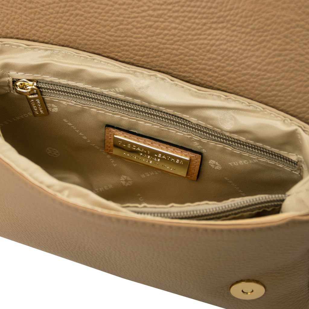 Oryginalny produkt Tuscany Leather©, certyfikat autentyczności i hologram uwierzytelniający w zestawie - Materiał: skóra o teksturze groszkowej, podszewka poliestrowa - Cechy: miękki korpus, 2 komory - Część zewnętrzna: metalowe TL logo - Część wewnętrzna: kieszeń boczna na zamek, centralna komora na zamek - Pasek na ramię: regulowany, skórzany - Elementy metalowe: w kolorze złotym - Zapięcie: zatrzask magnetyczny - Akcesoria: pokrowiec - Wymiary: 24.00 x 14.00 x 5.00 cm - Waga: 0.37 Kg