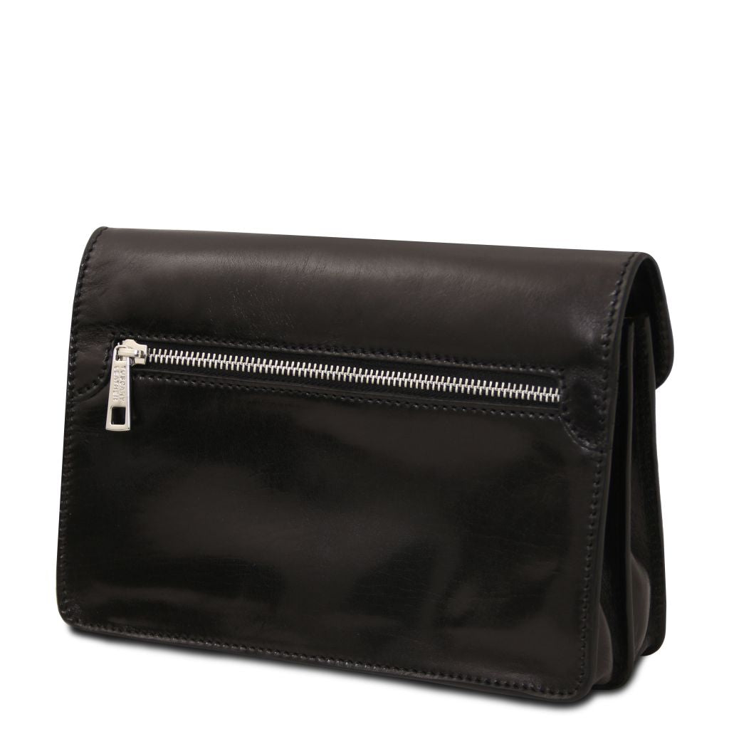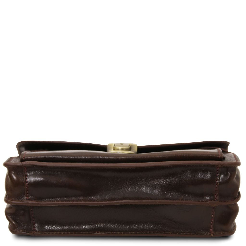 Oryginalny produkt Tuscany Leather©, certyfikat autentyczności i hologram uwierzytelniający w zestawie - Materiał: naturalna skóra licowa, ręcznie barwiona, garbowana przy użyciu tanin roślinnych, naturalny podszewka - Cechy: sztywny korpus, 2 komory - Część zewnętrzna: przednia kieszeń z zapięciem, kieszeń z tyłu z zapięciem - Część wewnętrzna: kieszeń na kartę płatniczą - Zapięcie: metalowa, wciskana sprzączka na kluczyk z wygrawerowanym Tuscany Leather logo - Uchwyt: skórzany i odpinany - Akcesoria: pokrowiec - Wymiary: 24.00 x 15.00 x 8.00 cm - Waga: 0.50 Kg