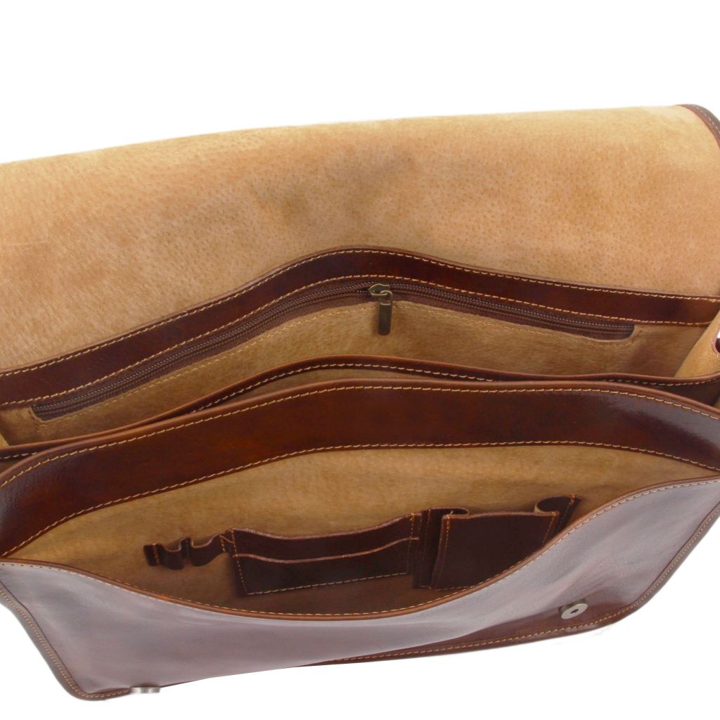 Oryginalny produkt Tuscany Leather©, certyfikat autentyczności i hologram uwierzytelniający w zestawie - Materiał: naturalna skóra licowa, ręcznie barwiona, garbowana przy użyciu tanin roślinnych, skórzana podszewka - Cechy: miękki korpus, 2 komory - Część zewnętrzna: metalowe, prostokątne Tuscany Leather logo, kieszeń z tyłu z zamknięciem - Część wewnętrzna: kieszeń niezamykana, kieszeń na kartę płatniczą, kieszeń na zamek, uchwyt na długopis - Pasek na ramię: regulowany skórzany - Pojemność: mieści 15.6" laptopa - Zapięcie: zatrzask magnetyczny - Wymiary zewnętrzne: 38.00 x 29.00 x 11.00 cm - Wymiary wewnętrzne (komór): 34.00 x 26.00 x 4.50 cm - Waga: 1.00 Kg